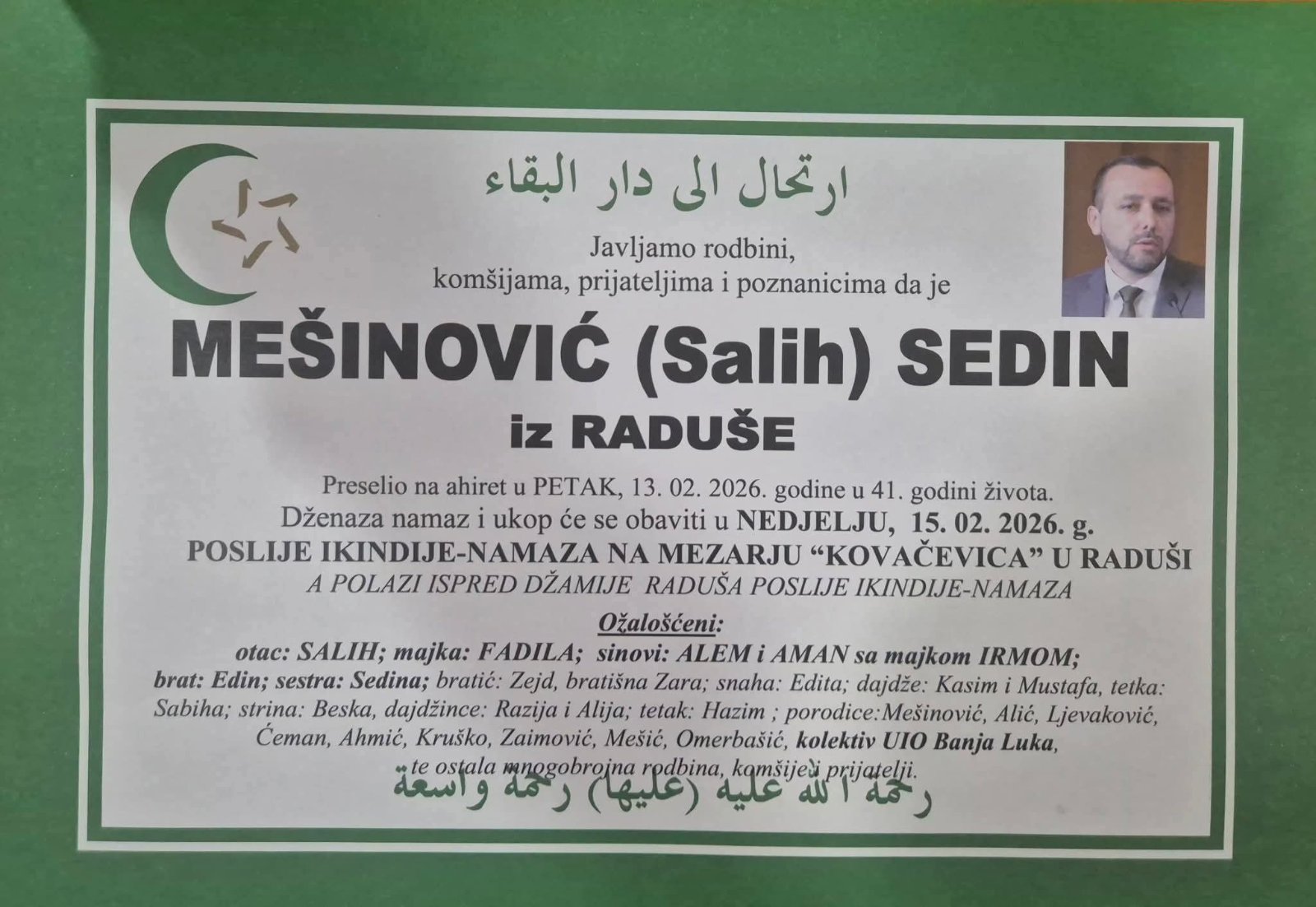 Podsjetimo, beživotno tijelo Mešinovića pronađeno je u petak u stanu u Banjoj Luci.